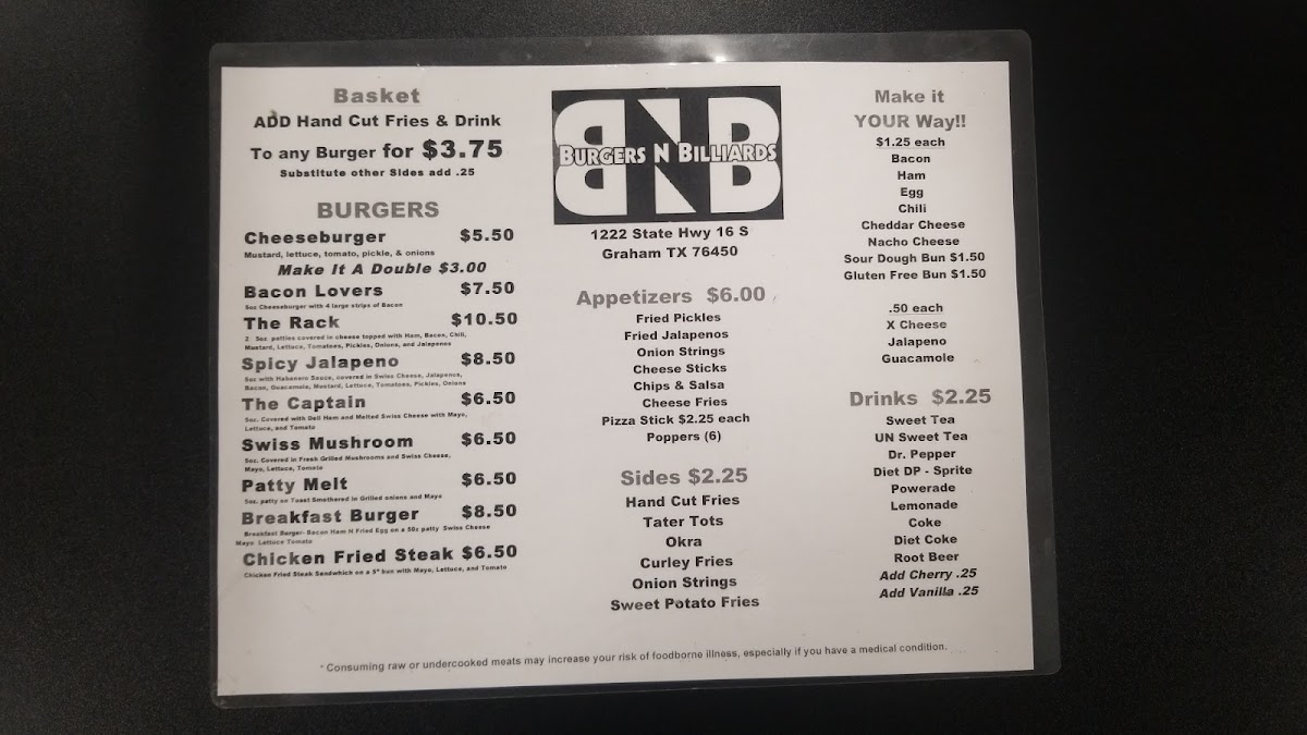 Located in the heart of Graham, Texas, Burgers & Billiards offers a unique dining experience that pairs delicious food with a lively atmosphere. Their burger selections are a customer favorite, with patrons raving about the flavors and friendly service. The menu features an array of sides like hand-cut fries, crispy tater tots, and seasoned curly fries—all priced at just $3.49.